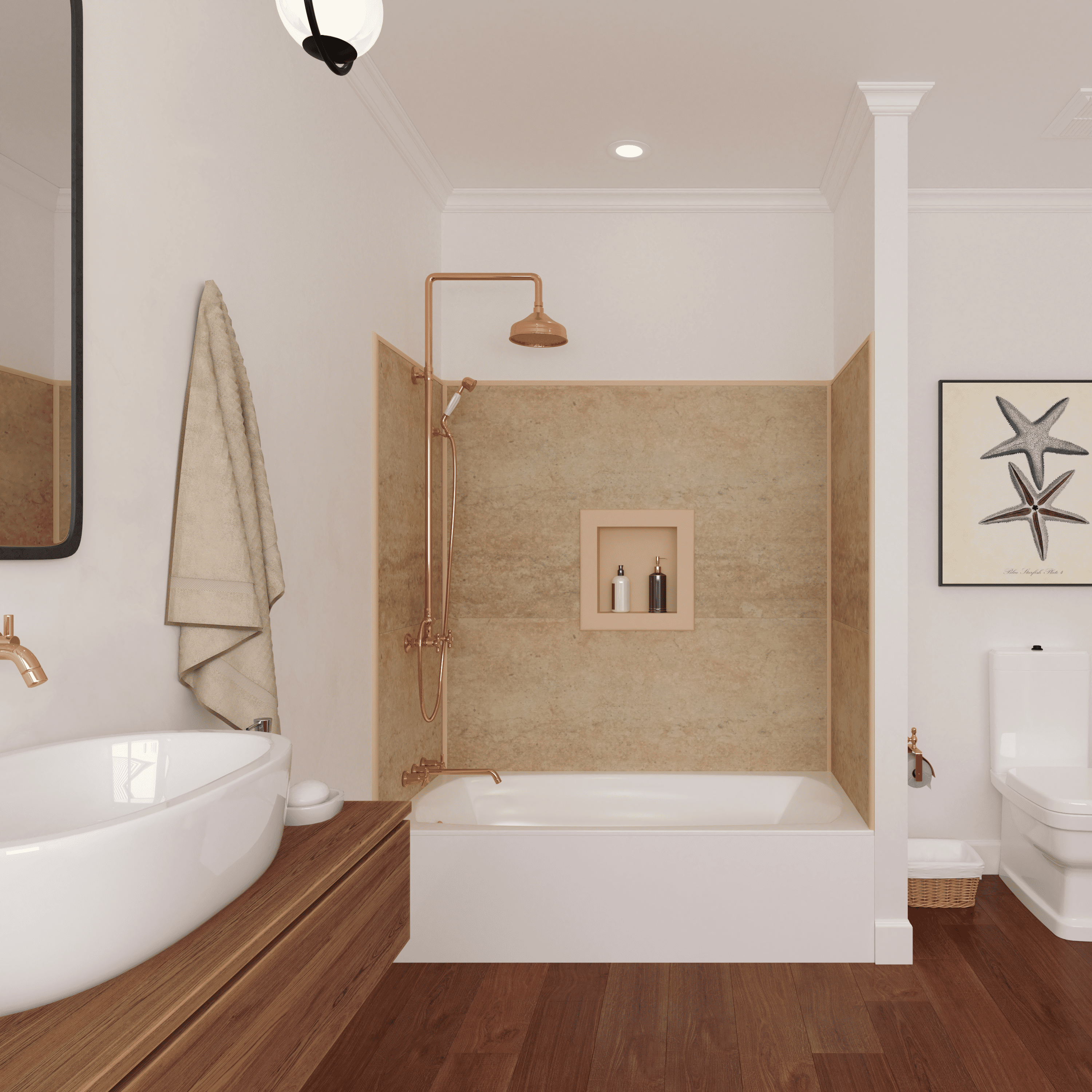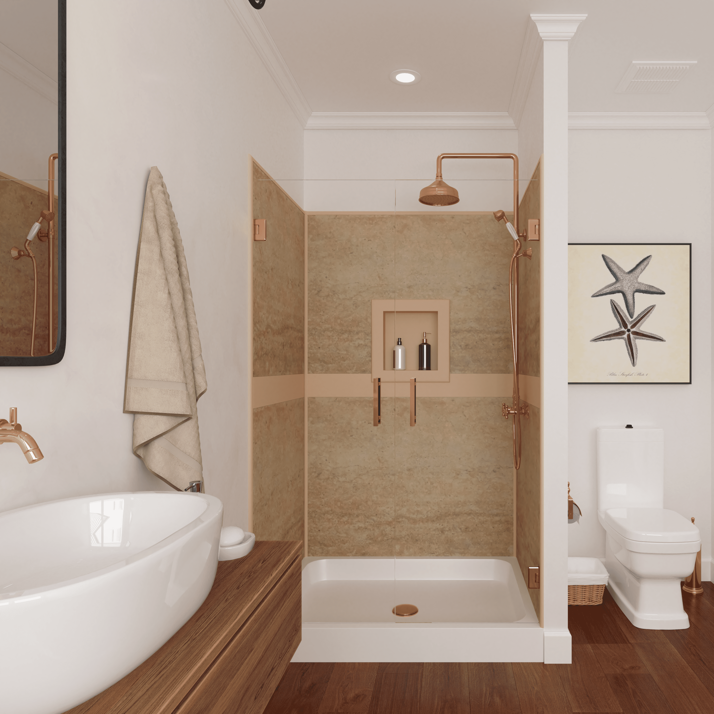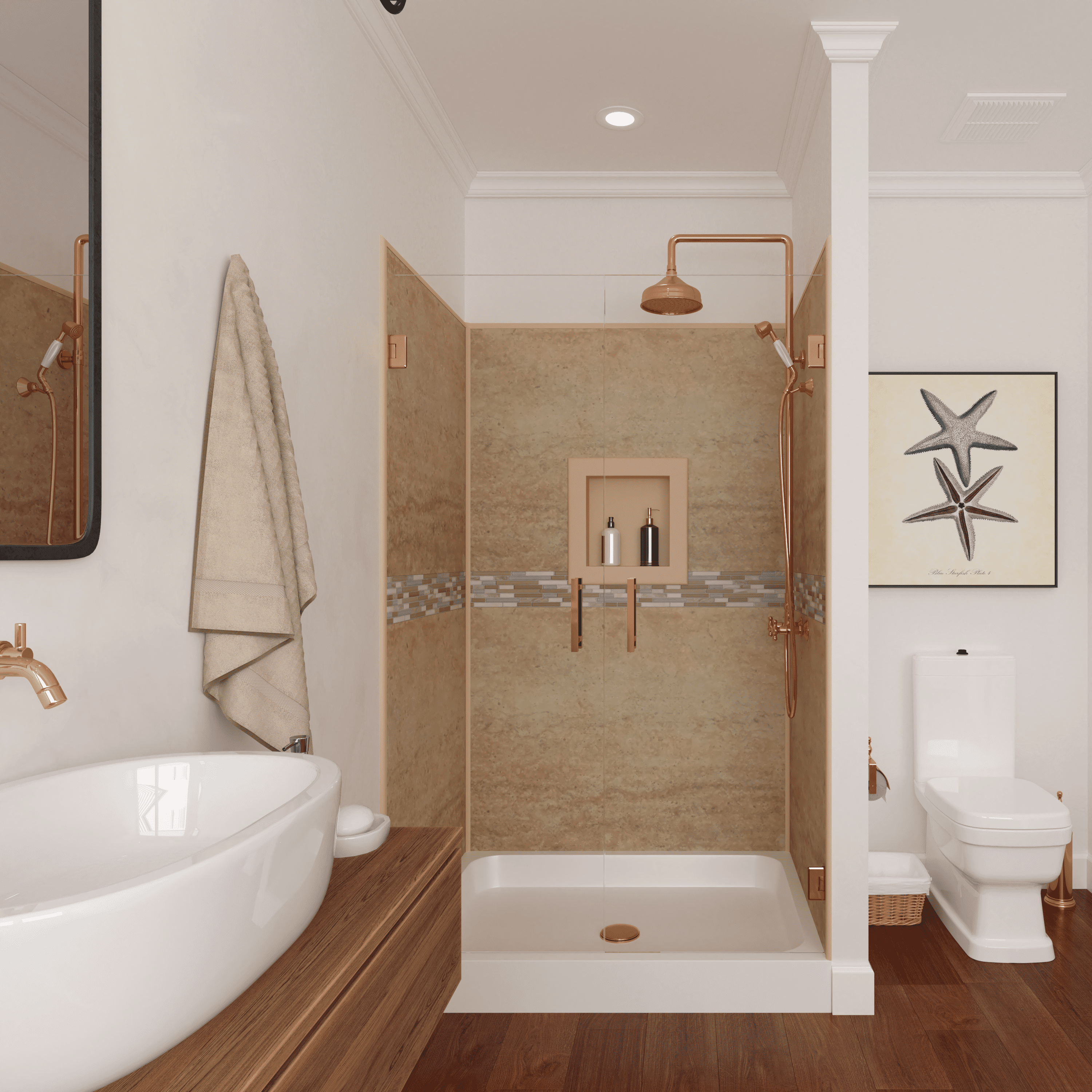 Bella CORE’s poly panels create a unique and elegant custom appeal that offers a solution to the messy grout that comes with installing tile and the vanilla acrylic inserts that have become so predictable.